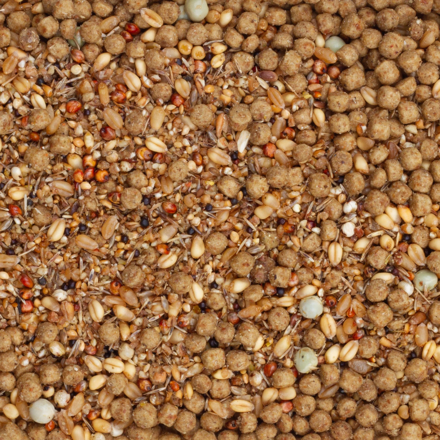 Weizen, Soya(bohnen) – Extraktionsschrotfuttermittel, Mais, Glucosesirup, Hirse, Sorghum, Sojaöl, Rapssamen, Erbsen, Graspflanzensaat, Honig, Weiβer Sorghum ‘dari weiβ’, Kanariensaat, Leinsaat braun, Sonnenblumenöl, Rapssamenöl, Natriumchlorid