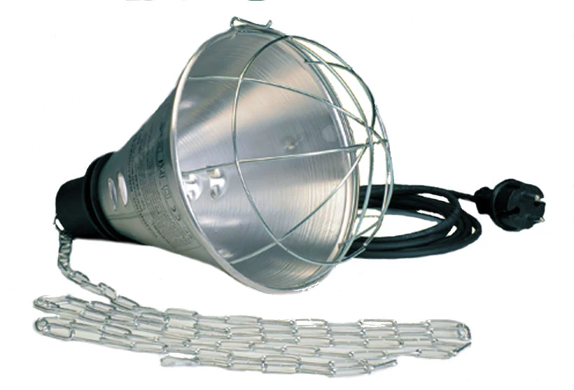 mit Metallschirm, 2 m langer Kette und Karabinerhaken. Fassung E 27, Anschlussleitung 2,50 m lang. Tropfwasser geschützt und schutzisoliert.